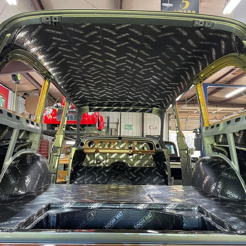 Boom Mat Damping Material solves the problem of noise, vibrations, squeaks and rattles that come from roads, stereos, engines & more. Boom Mat Vibration Damping Material is a premium quality damping material providing extreme noise damping for the most demanding commercial and sound competition applications. Interior panels vibrate and generate noise. Boom Mat stops that noise by trapping it between our thick, 4 mil aluminum stiffening top skin and the asphalt free, pure butyl, noise constraining layer. Plus worry-free no snag adhesion to any interior surface, vertical or overhead, even in the most demanding of temperature extremes. Those quality components are what makes Boom Mat Vibration Damping Material require only 25-50% coverage to get the job done. This saves weight, material cost and installation time. Easy peel plastic release liner (not a paper backing that tears) Enhances stereo performance and sound Gives you a quiet and comfortable interior Minimal prep & install time Performs in extreme temperatures Use as a first layer to control noise and dampen vibrations 10 (ten) 12.5in x 24in sheets (20 sq. ft.) 2mm thick